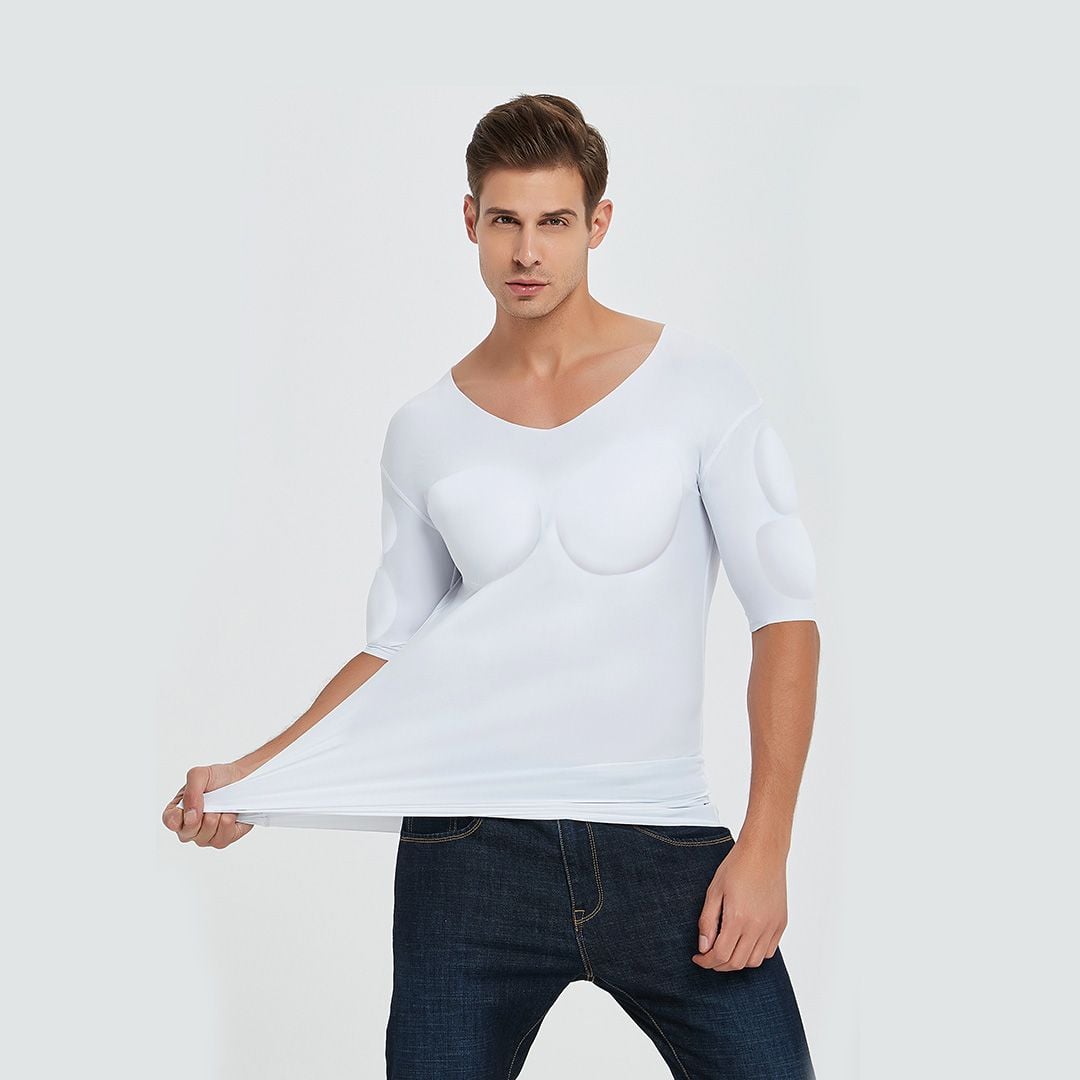 بلوزة باللون الأبيض مع حشو على مناطق العضلات في الجسم، عضلات وهمية، يتم ارتداؤها تحت الملابس - نصف كم