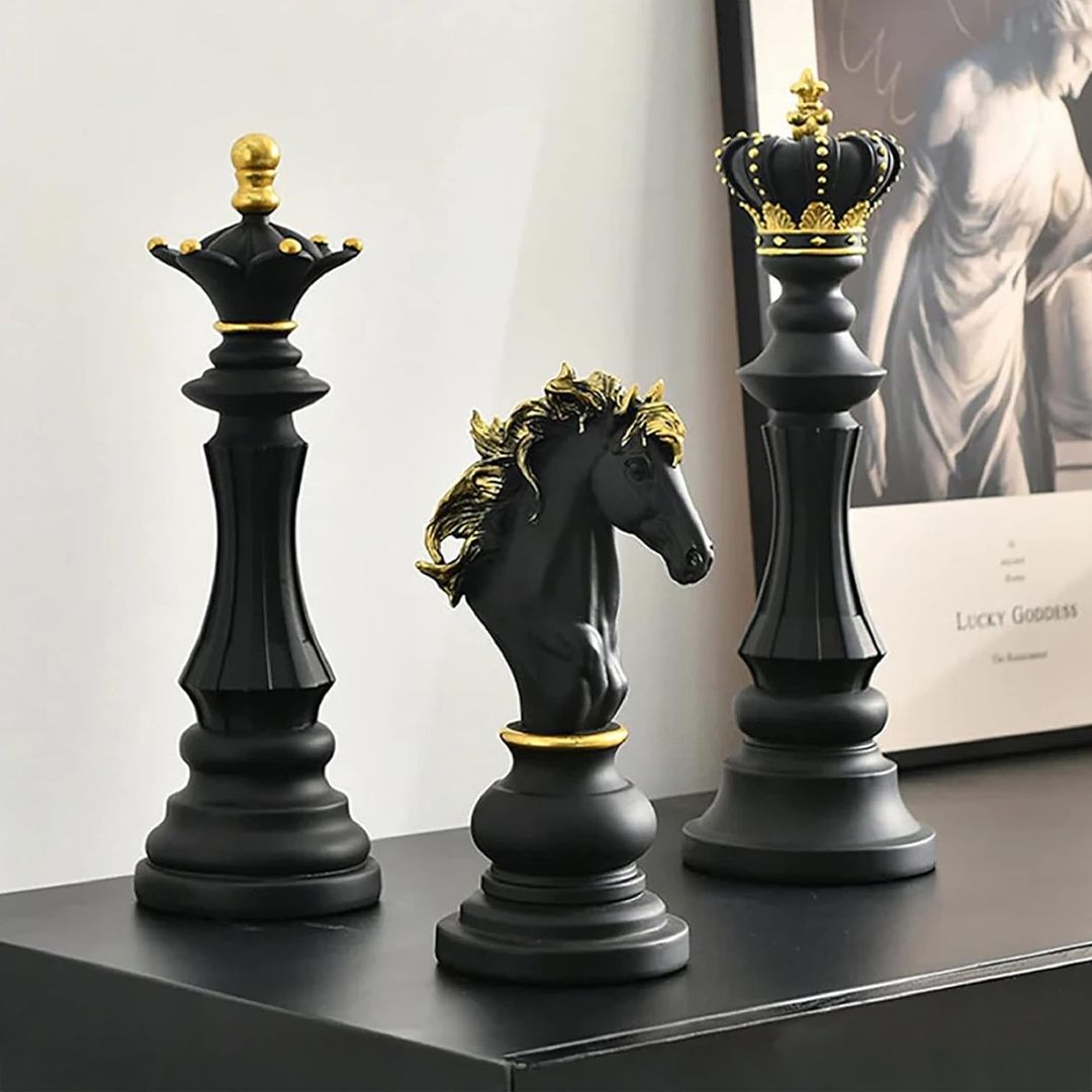 طقم ديكوري مستوحى من قطع الشطرنج الملكية، يضم الملكة، الملك، والحصان، بتفاصيل دقيقة ولمسات ذهبية تضفي طابعًا فاخرًا على أي مساحة.