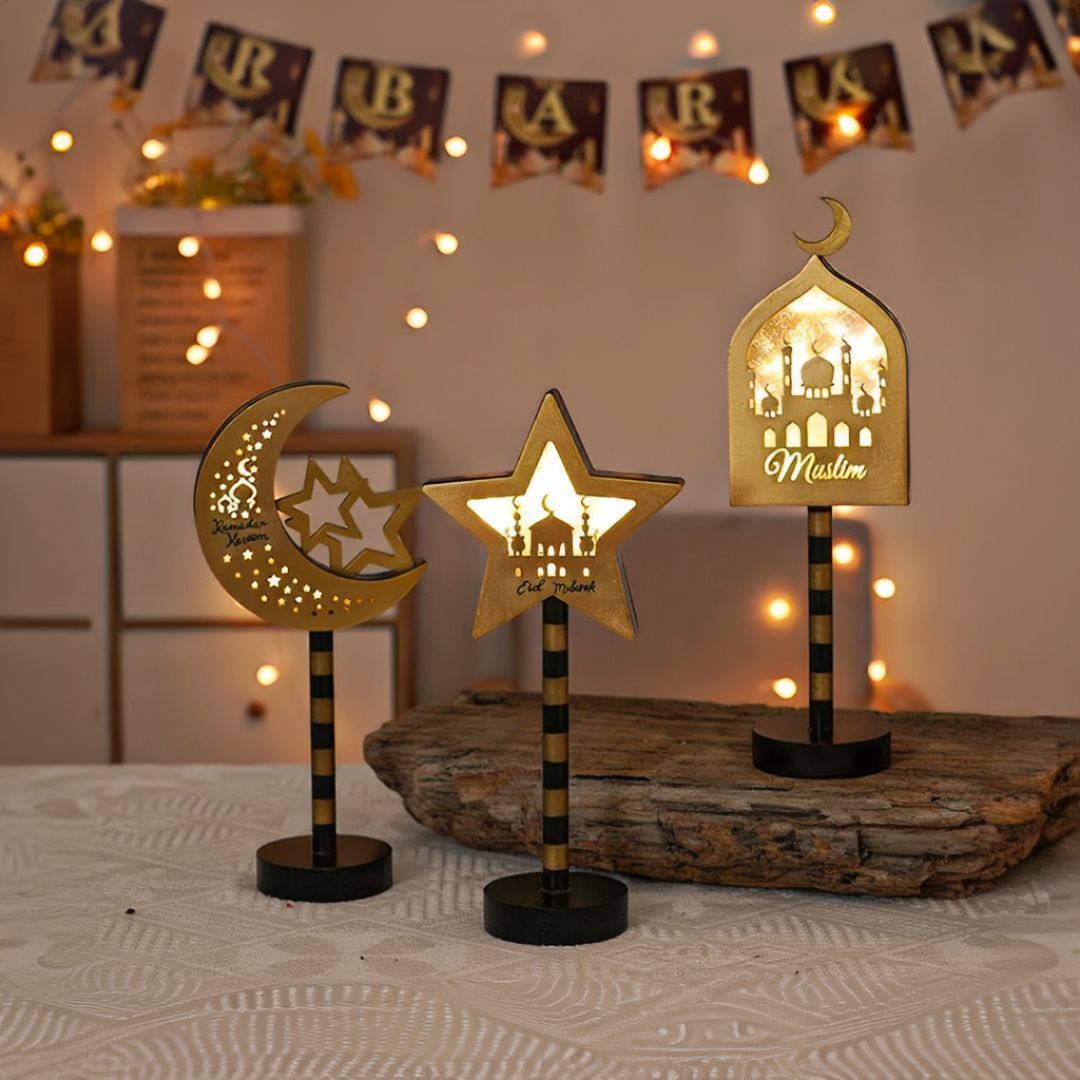مجموعة ديكورات رمضانية خشبية بإضاءة ليد شكل المسجد شكل الهلال و النجمة شكل النجمة