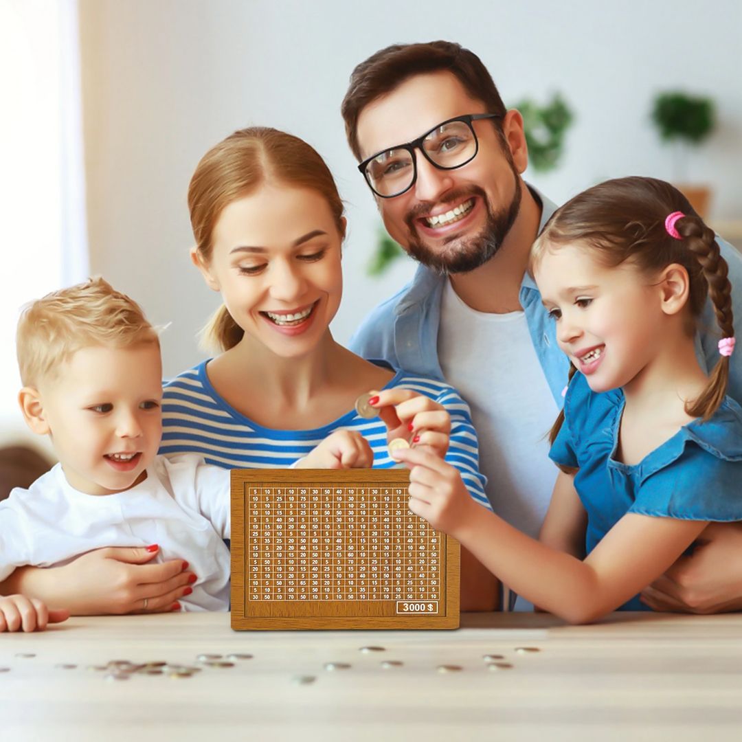حصالة خشبية أنيقة مع عداد مطبوع لتتبع المدخرات حتى تصل إلى 3000 وحدة نقدية. تأتي مع فتحة مخصصة للعملات المعدنية ومكان لحفظ القلم لتوثيق الأهداف بسهولة