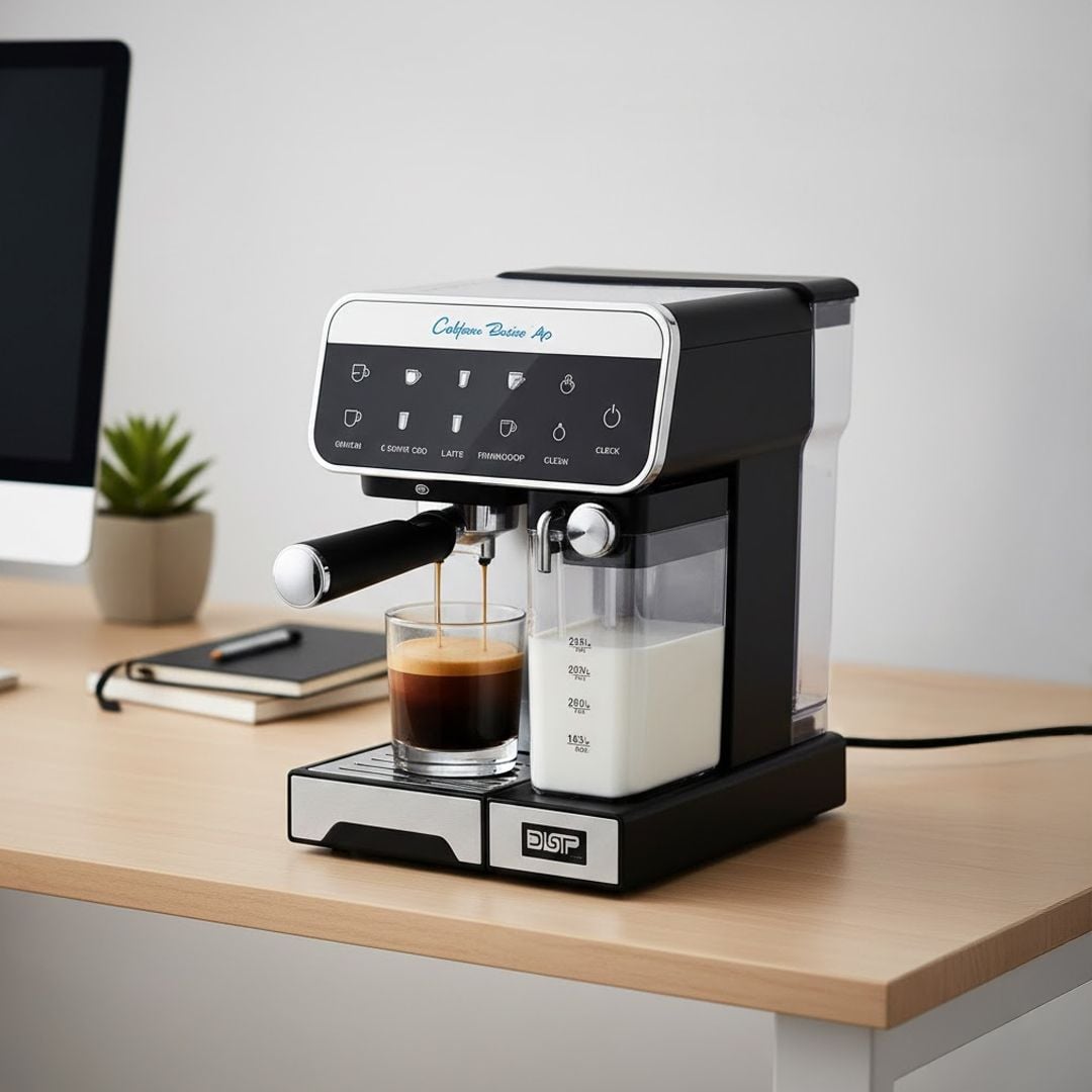 التصميم: ماكينة إسبريسو احترافية بتصميم عصري فاخر، تجمع بين الخطوط الأنيقة والواجهة الرقمية الذكية، لتكون قطعة راقية تكمّل أي مطبخ حديث أو ركن قهوة منزلي.