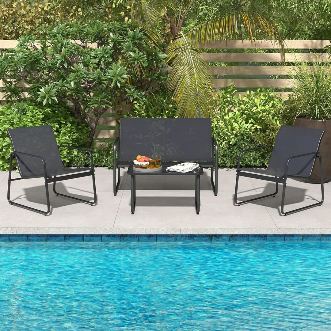 طقم أثاث خارجي المكون من 4 قطع، والذي يتضمن أريكة ذات مقعدين وكرسيين وطاولة أنيقة. تم تصميم هذا الطقم ليكون مثالياً للحدائق والفناءات، مع مقاعد مريحة تسمح لك بالاسترخاء والاستمتاع باللحظات الجميلة مع الأهل والأصدقاء.