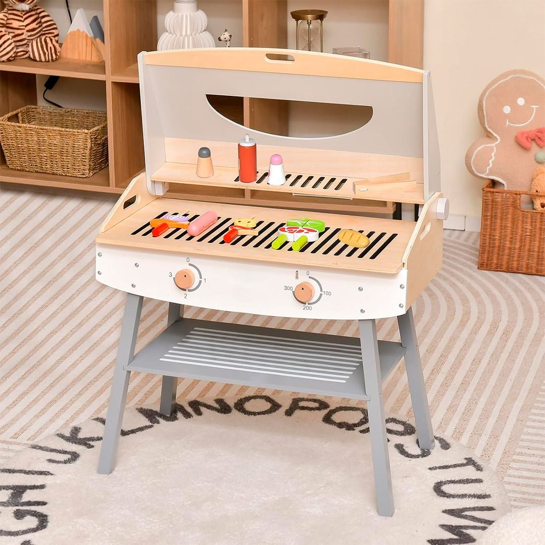 المقابض: يوجد مقبضان في الجزء الأمامي، مصممان لمحاكاة أدوات التحكم في درجة الحرارة، مما يعزز الواقعية ويتيح للأطفال تجربة التعديل على درجة حرارة الشواء.