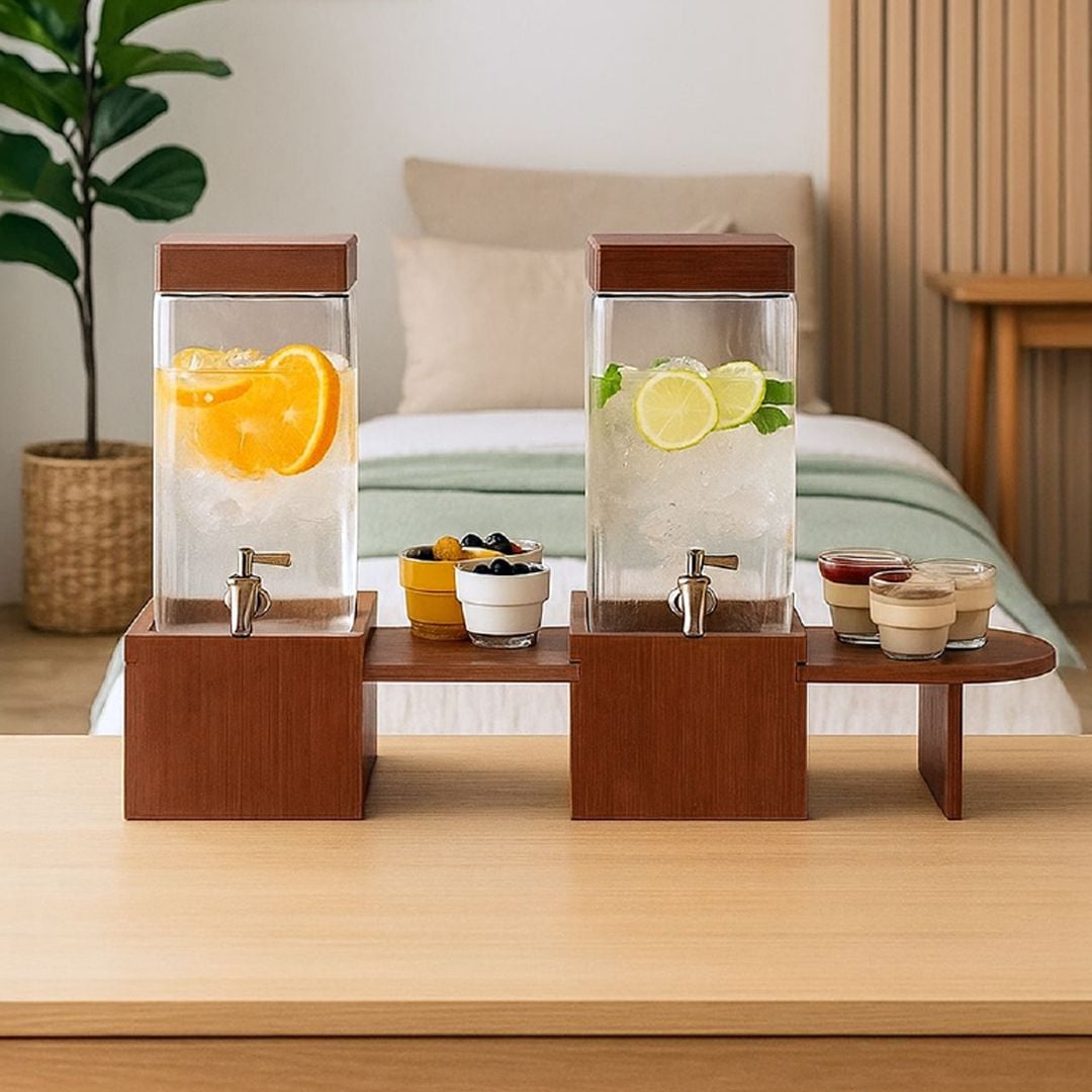 تصميم أنيق يجمع بين الجمال والعملية، يقدّم مشروباتك بأسلوب راقٍ وسهل. زجاج شفاف بلمسة عصرية مع قاعدة خشبية متينة تضيف فخامة واضحة وتحوّل أي مناسبة إلى تجربة تقديم مميزة.