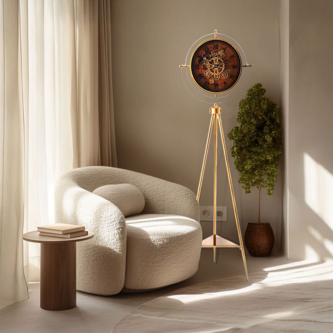 التصميم: ساعة ديكور أرضية فاخرة بتصميم مستوحى من آلية التروس الكلاسيكية، تجمع بين الطابع الصناعي الأنيق واللمسة الذهبية العصرية. تركيبتها القائمة على ثلاث أرجل معدنية تمنحها مظهرًا هندسيًا متوازنًا، بينما يبرز وجه الساعة الدائري بتفاصيل دقيقة وحركة تروس مرئية تضيف طابعًا ديناميكيًا للمكان.