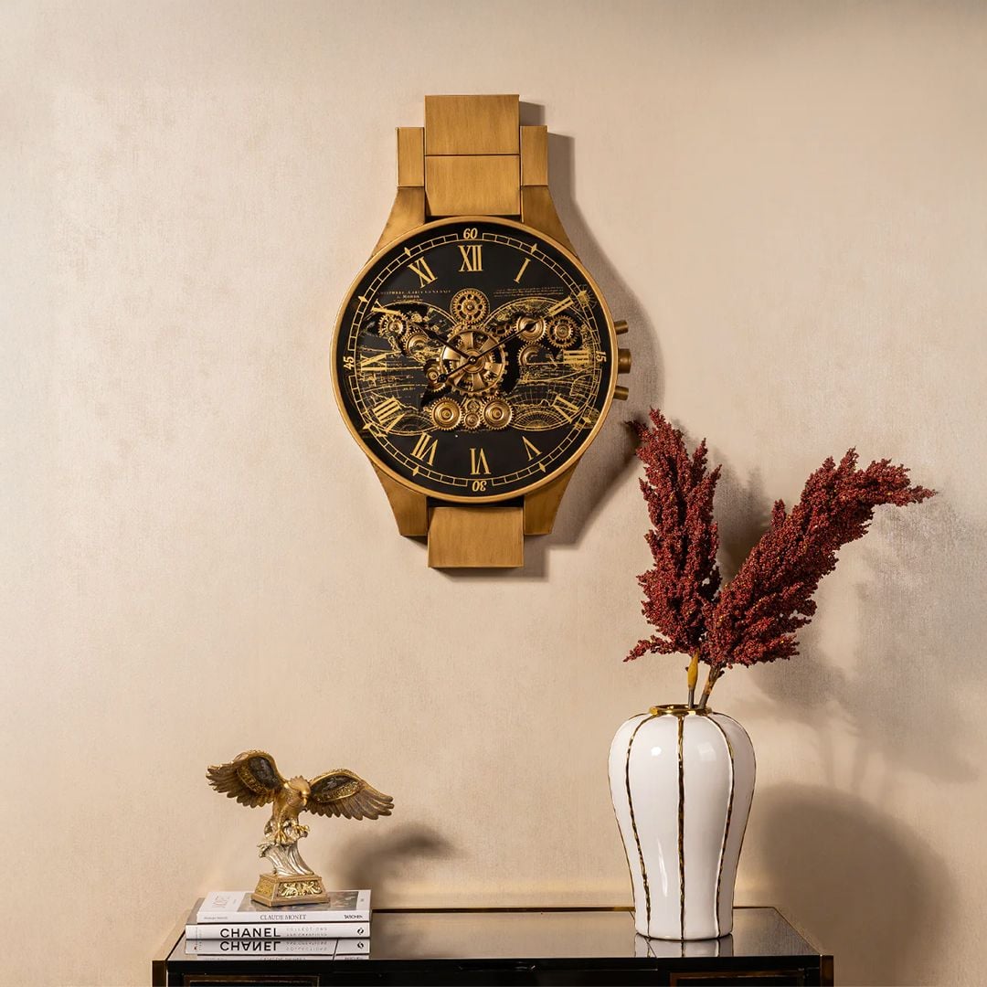 ساعة حائط بتصميم ساعة يد بتروس ذهبية