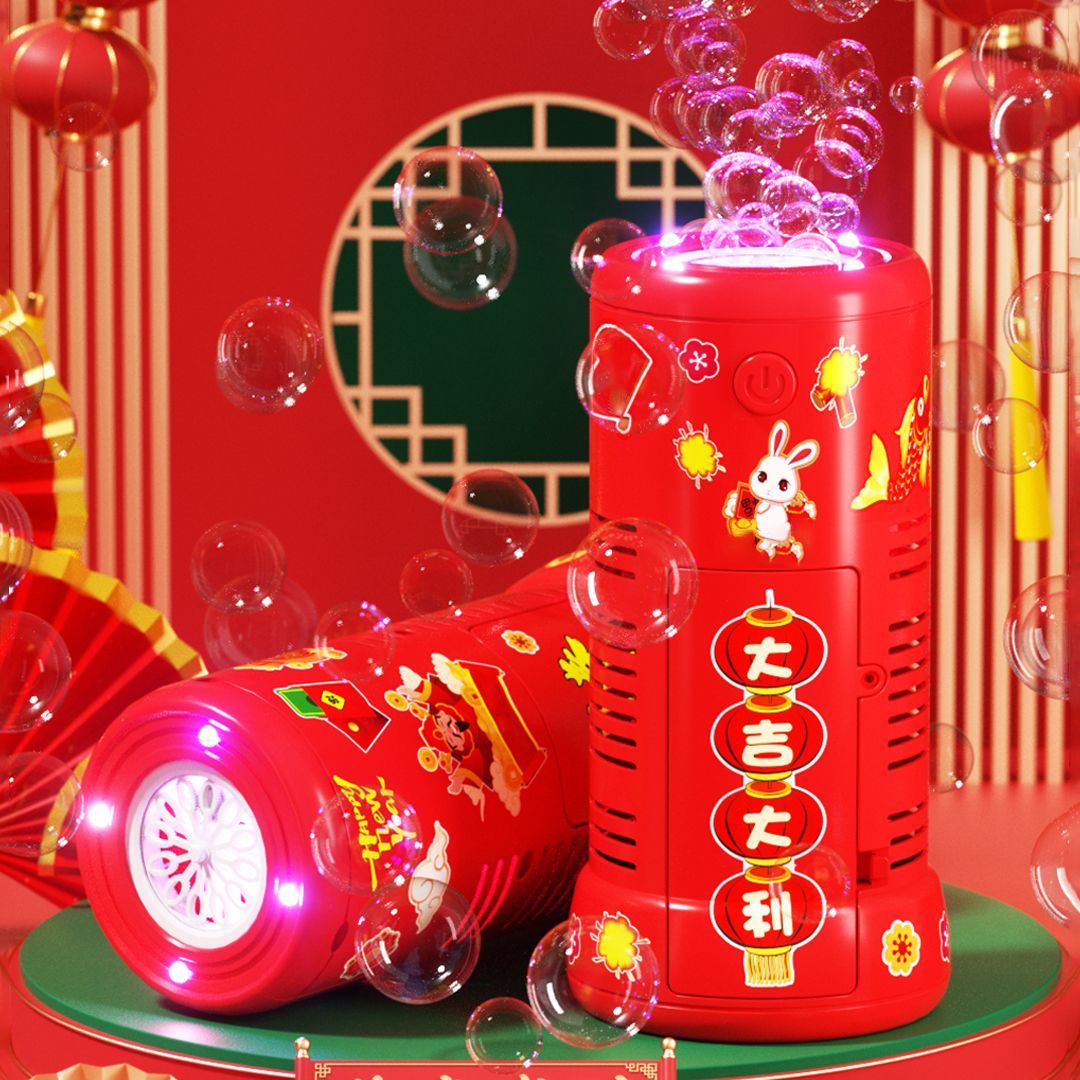 آلة فقاعات الألعاب النارية المحمولة، بتصميم مكون من 12 فتحة لإخراج الفقاعات باستمرار، مع مؤثرات صوتية للألعاب النارية وإضاءة